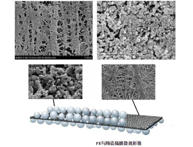 市面上常見的隔膜是PP、PE、或者兩種復(fù)合加工制成。雖然這些微孔聚烯烴隔膜具有優(yōu)異的機(jī)械強(qiáng)度及化學(xué)穩(wěn)定性,但是這些隔膜由于制備過程中存在內(nèi)應(yīng)力,在高溫環(huán)境下應(yīng)力釋放,隔膜會(huì)發(fā)生明顯的熱收縮效應(yīng)從而使得電池內(nèi)部正負(fù)極材料直接接觸導(dǎo)致內(nèi)短路產(chǎn)生,發(fā)生安全故障。將納米氧化鋁或勃姆石顆粒涂覆于隔膜表層則能高效的提高鋰電池的安全性。將陶瓷粉體與PVDF、NMP溶解混合、分散均勻后,開啟涂布機(jī)將PE隔膜上進(jìn)行陶瓷粉體涂布,陶瓷涂層厚度可以控制,之后在80℃下干燥24h即制得陶瓷隔膜。陶瓷隔膜微觀形貌如圖所示。