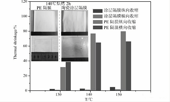 陶瓷涂層有利于提高隔膜的耐高溫性質(zhì),將陶瓷隔膜和普通隔膜放于不同溫度的箱子中2h,兩種隔膜在收縮率上有很大的區(qū)別。隔膜在高溫下會(huì)收縮是因?yàn)楦裟ぴ谥苽溥^程中由于牽引拉伸使得隔膜存在內(nèi)應(yīng)力,在高溫環(huán)境下由于隔膜內(nèi)部分子鏈的運(yùn)動(dòng)導(dǎo)致應(yīng)力釋放從而發(fā)生大面積收縮;但是陶瓷涂層隔膜在140℃烘烤條件下除隔膜顏色發(fā)生變化以外其本身的形態(tài)未發(fā)生改變,當(dāng)在隔膜表面兩側(cè)涂覆的無機(jī)涂層具有耐高溫隔熱性能,從而降低基體隔膜本身的溫度,使得隔膜在高溫環(huán)境下仍保持原有形態(tài)。